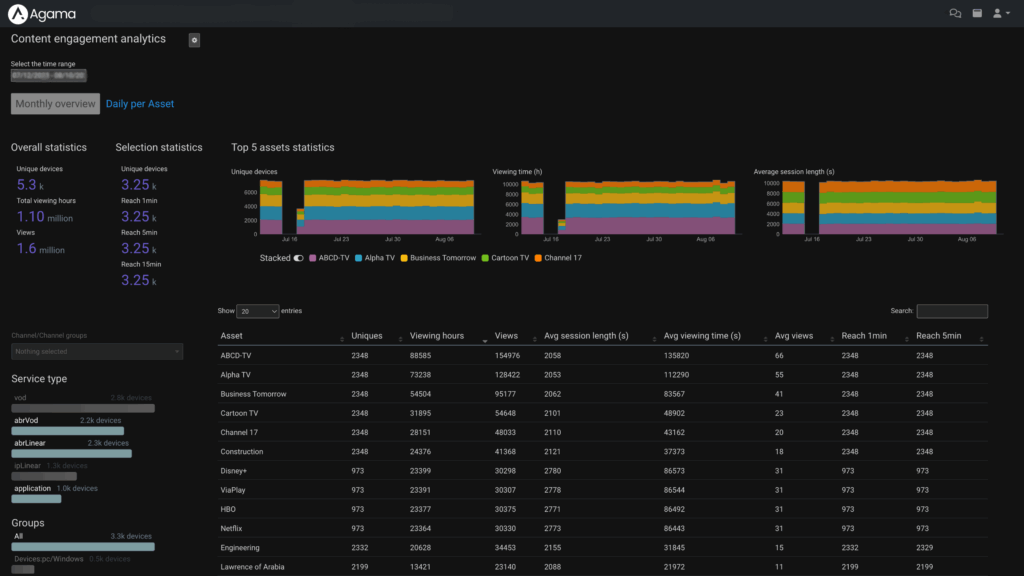 The Agama Content Engagement Analytics solution supports a broad set of key industry metrics, like content reach, viewing times, and unique viewers – for both direct and companion app consumption.