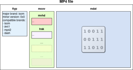 - an ftyp (file type) box, identifying itself as an MP4 and providing additional compatibility information,