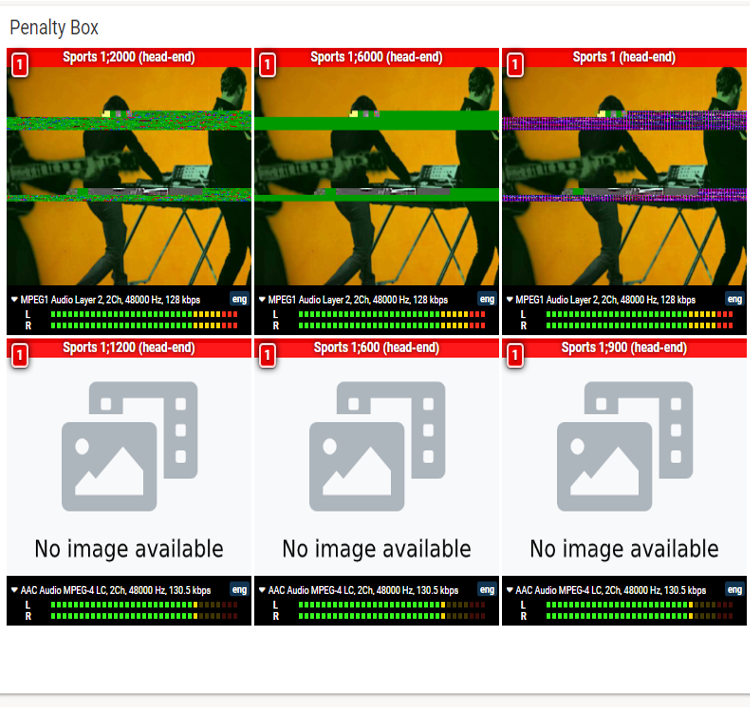 The new Penalty Box provides an immediate visual understanding of ongoing incidents for video head-end analyzers. Considered one of the smartest functionalities in the suite, the widget shows thumbnails and audio bars for impacted channels, providing quick visual confirmation and highlighting of problems.