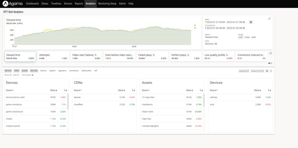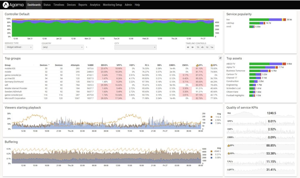 The Dash.js plugin is used for the Agama Client Device Monitoring and Analytics solution, which provides visualization, analytics, alarming, and correlation, to enable real-time end-user experience insights. The solution is scalable, supports all modern delivery technologies and can be used in OTT, IPTV, Cable, or hybrid deployments.